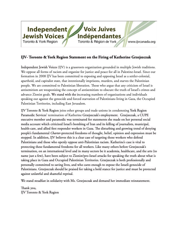 The following statement was sent by Independent Jewish Voices to the York Region Paramedics management and to York Region Council. Names, titles, and email addresses of the recipients can be found here.